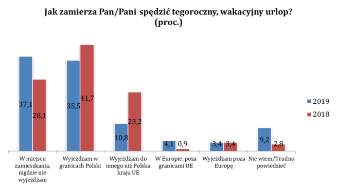W 2019 r. może czekać nas gorszy sezon turystyczny. Na wakacje wyjedzie tylko co drugi Polak. Najchętniej nasi rodacy będą spędzać urlop na terenie kraju – 35,5 proc. Drugim najpopularniejszym kierunkiem są pozostałe państwa Unii Europejskiej. W dalszą podróż, poza UE, wybierze się 7,5 proc. Ankietowanych, z czego 3,4 proc. wyjedzie poza Stary Kontynent – wynika z badania Diners Club Polska. W miejscu zamieszkania zostanie ponad 37 proc. respondentów, a 9,2 proc. jeszcze nie ma sprecyzowanych planów na wakacje.