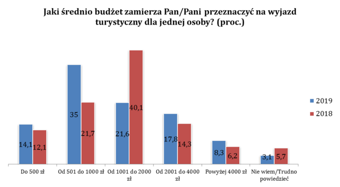 Zmiany widać także w planowanych budżetach. Blisko połowa ankietowanych (49,1 proc.) chce się zmieścić w kwocie do 1 tys. zł na osobę. Jest to wzrost o 15,3 pkt. proc. względem ubiegłego roku, gdy najpopularniejszym budżetem było 1-2 tys. zł. Z drugiej strony rośnie grupa turystów, która wyda więcej. Z 14,3 do 17,8 proc. urósł odsetek badanych z zaplanowanym budżet między 2 a 4 tys. zł. Natomiast 8,3 proc. Polaków planuje wydać powyżej 4 tys. zł na osobę.