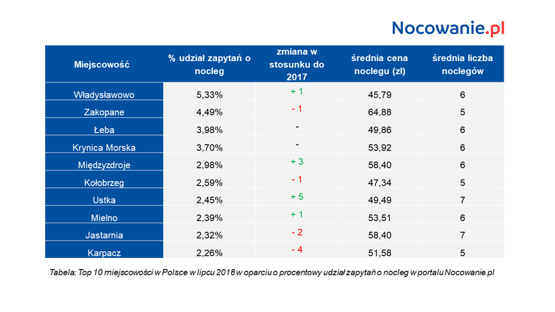 W lipcu najpopularniejsze okazało się Władysławowo (5,33% wszystkich zapytań o nocleg w kraju), na drugim miejscu Zakopane (4,49%), następnie Międzyzdroje (2,98%), Kołobrzeg (2,59%), Ustka (2,45%), Mielno (2,39%), Jastarnia (2,32%), a dziesiątkę najpopularniejszych miejsc w Polsce zamyka Karpacz (2,26%).