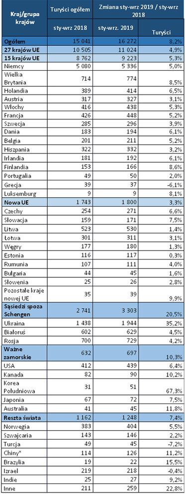 W pierwszych trzech kwartałach 2019 roku nasz kraj odwiedziło o 8,2% więcej turystów zagranicznych w porównaniu do pierwszych 9 miesięcy 2018 roku. Największą dynamikę wzrostu zanotowaliśmy na rynku południowokoreańskim - 67,3%.