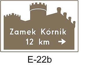 - w celu wskazania kierunku do obiektów turystycznych lub wypoczynkowych stosuje się znaki E-7 do E-12 i E-12a (drogowskazy do obiektów turystycznych lub wypoczynkowych).
